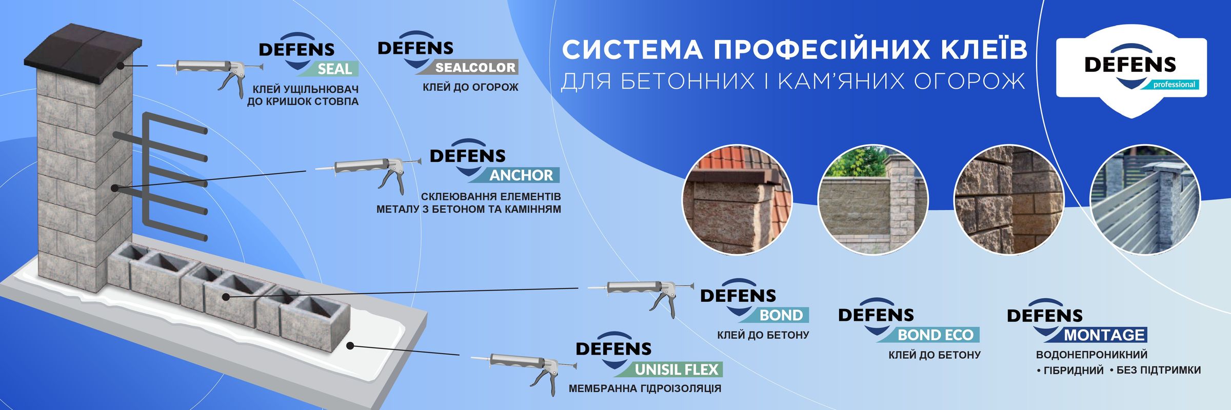 Defens Professional - это система профессиональных клеев, предназначенных для популярных ограждений и заборов из бетонных блоков. Она состоит из семи продуктов: гидроизоляционной мембраны Defens Unisil Flex, клея для бетона Defens Bond и Defens Bond Eco, герметизирующего клея Defens Seal и Defens Seal Color, химического анкера Defens Anchor, а также Defens Montage, предназначенного для склеивания XXL блоков, камней и фасадных панелей.